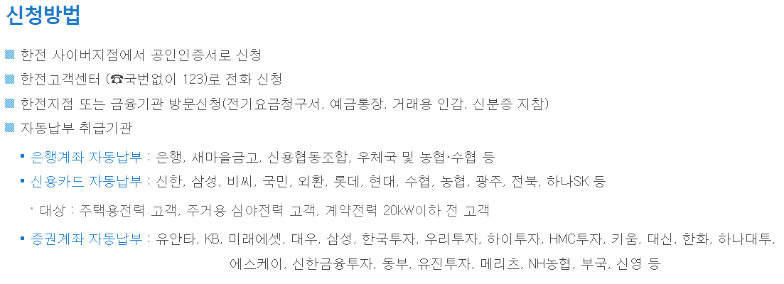 신청방법과 자동납부 취급기관을 한 번 더 아래에 정리해보겠습니다.